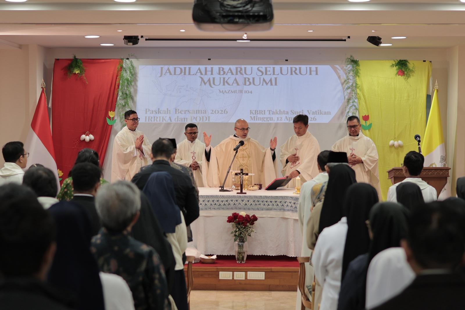 Veritas Indonesia-ROMA, 12 April 2026-Di tengah situasi global yang diselimuti ketidakpastian akibat konflik di berbagai belahan dunia, sukacita Paskah menyapa komunitas Indonesia di Vatikan dengan pesan harapan yang kuat. Bertempat di KBRI Takhta Suci, sekitar 300 imam, biarawan-biarawati, serta kaum awam berkumpul dalam perayaan Paskah Bersama IRRIKA dan PODI tahun 2026.