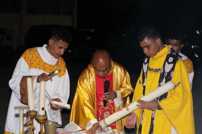 Sejak awal liturgi, umat diajak masuk ke dalam simbol besar Paskah: perjalanan dari kegelapan menuju terang. Dalam khotbahnya, Pater Yosef Keladu menegaskan bahwa Malam Paskah merupakan malam paling sakral karena menandai peralihan dari kegelapan menuju terang.