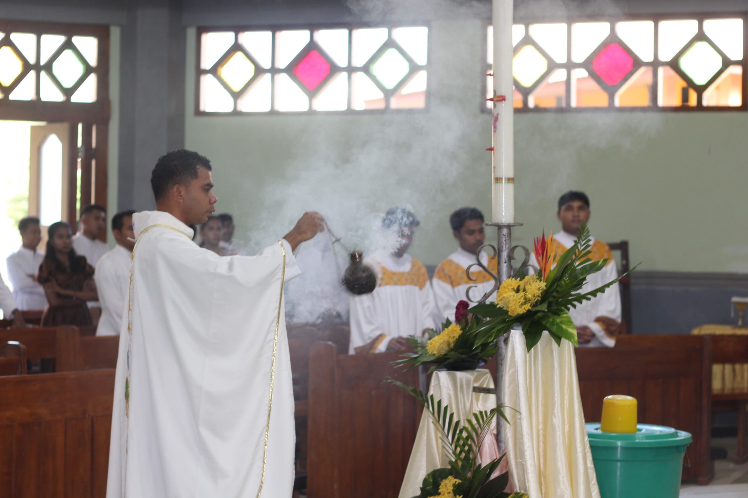 Kelompok koor dari Unit St. Yosef Freinademetz Ledalero saat membawakan lagu-lagu pujian yang menghidupkan suasana perayaan Paskah. Partisipasi aktif para frater dalam petugas liturgi menjadi bagian integral dari tradisi perayaan di seminari tersebut.