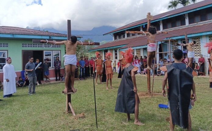 MANGGARAI, FLORES — Veritas Indonesia– Ribuan umat Katolik memadati Stasi Hati Kudus Mendo, Keuskupan Ruteng, Desa Golo Mendo, Kecamatan Wae Ri’i, Kabupaten Manggarai, pada Jumat, 3 April 2026, untuk mengikuti perayaan tablo kisah sengsara Yesus Kristus yang diselenggarakan oleh Orang Muda Katolik (OMK) setempat.